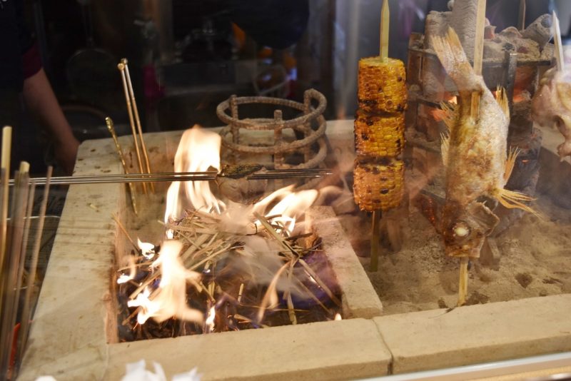 燃え上がる日の中に、串に刺した素材を突っ込んで焼きます!藁を少しずつ足して火力を維持しながら火を通していくのです。原始焼きに負けじと大迫力!
