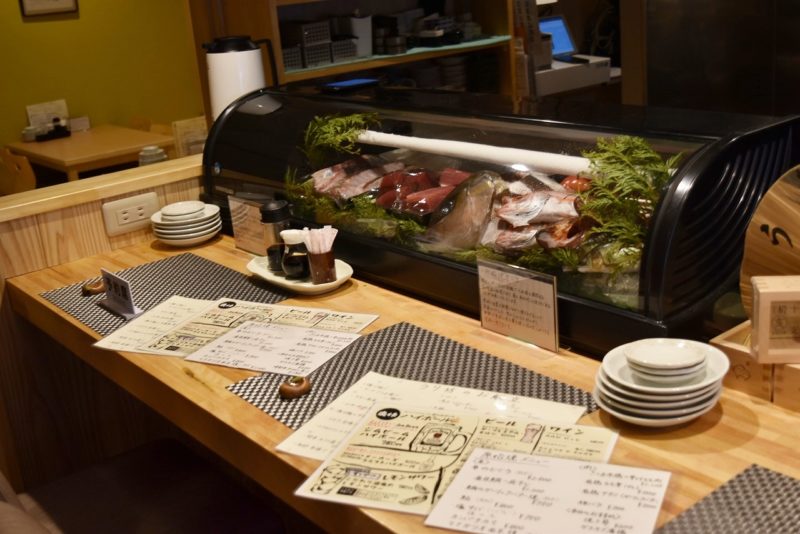 原始焼きが焼き上がる間、居酒屋メニューも楽しめます!カウンターには、原始焼き用のスペースだけでなく、鮮魚用のショーケースもあり、新鮮なお魚がずらり。