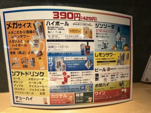 驚くこと無かれ、実は飲み物も全品390円なんです。