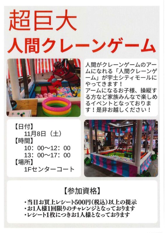 11月8日(土)には、なんと人間がクレーンゲームのアームとなる「人間クレーンゲーム」が開催!