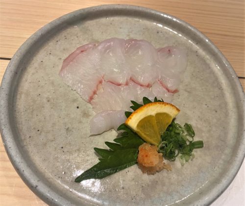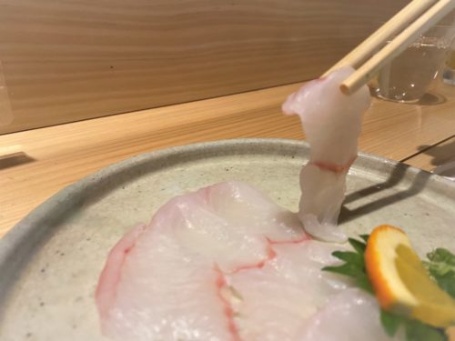 ウツボの刺身。透明でフグのよう。