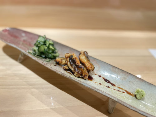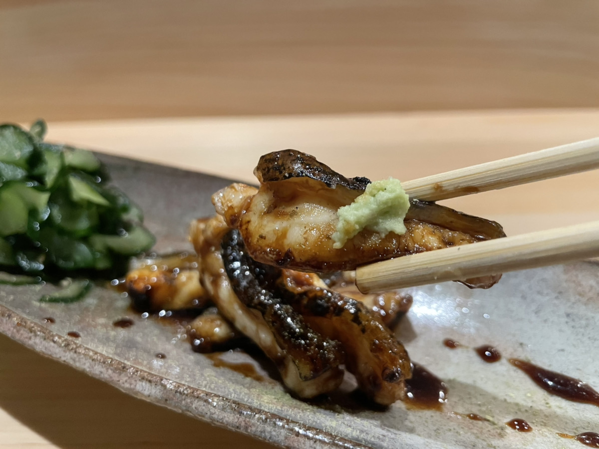 ワサビを付けていただきます。ウナギより歯ごたえがしっかりしていて、プリプリです。