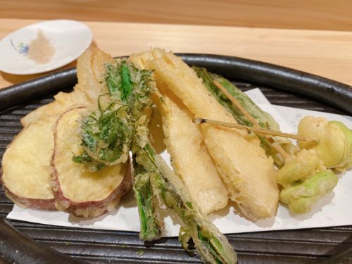 天ぷらの盛り合わせ。タケノコ、タラの芽、こごみなど春の野菜の天ぷら。えぐみがなく、春を感じる柔らかな味です。