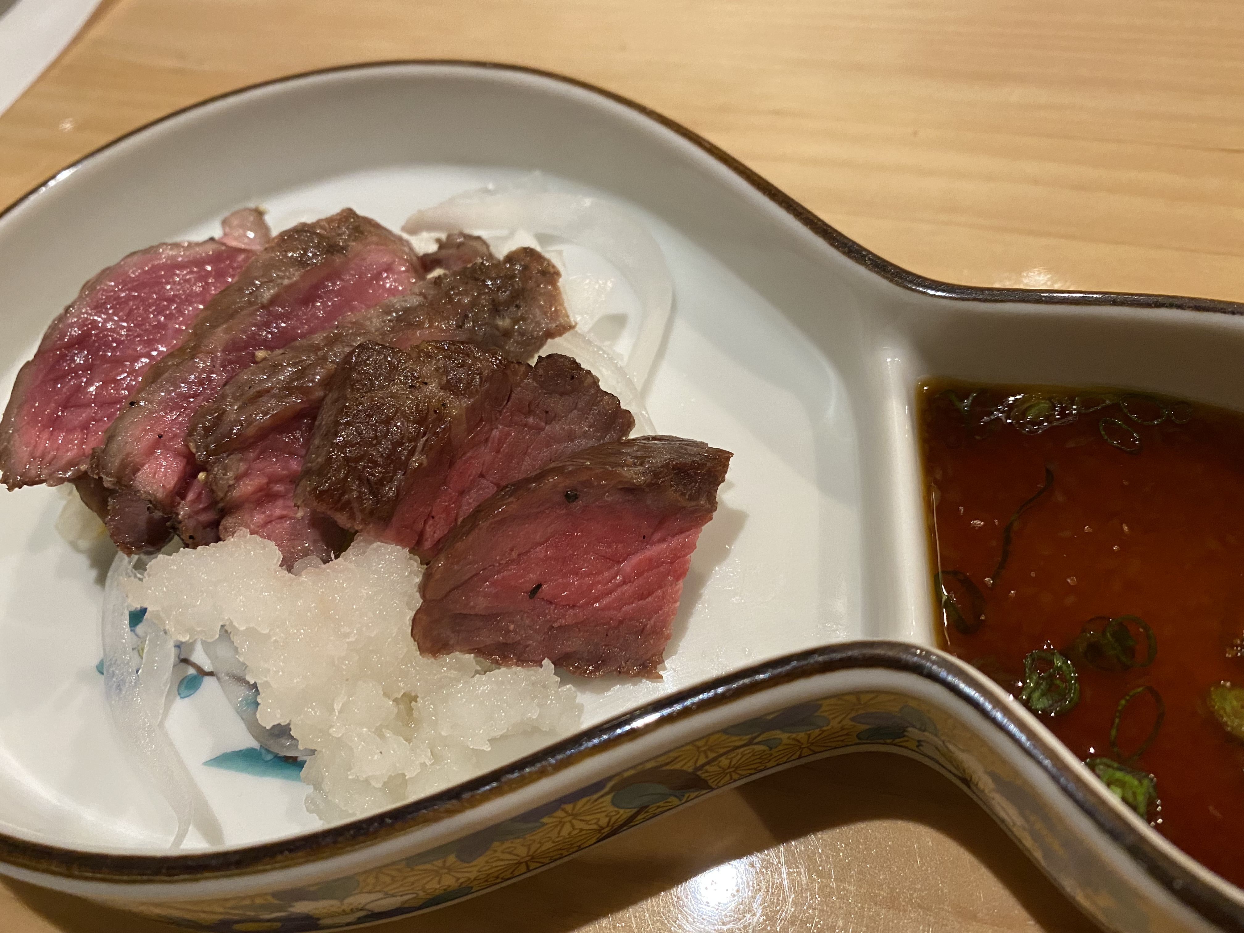 お肉もありますよ。この日は佐賀牛のステーキ。ポン酢でいただきます。