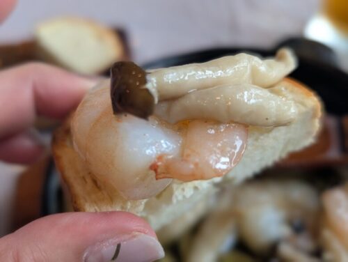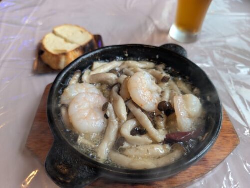 グツグツと熱々の状態で提供される小海老と木の子のアヒージョ。