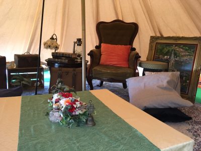 テントの中には、テーブルやアンティーク風の家具や絵画が置かれていて、贅沢な空間になっています。