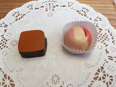 食べてみると、「根子岳」はナッツのペーストが濃厚で味わい深いシャンドゥーヤ。「シャンパーニュ」の方は、ガナッシュが柔らかく、甘く爽やかなひと粒でした。好きなチョコをちょっとずつ味わえるのは嬉しいシステムです。