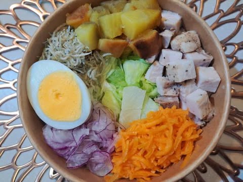 ちりめんじゃこ、ローストポーク、焼き芋、ゆで卵、キャロットラペ、レタス、季節の野菜が入っています。