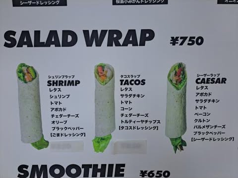 チョップドサラダ専門店ですが、他にもサラダラップやスムージーもあります。