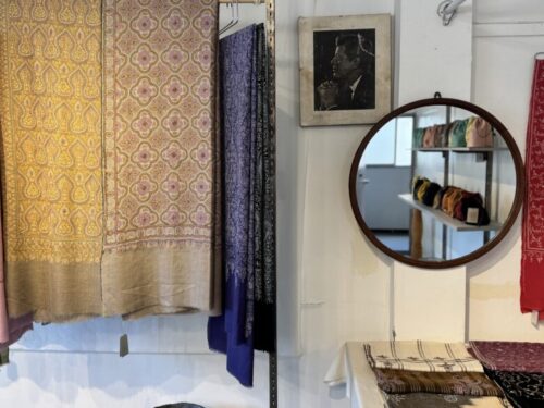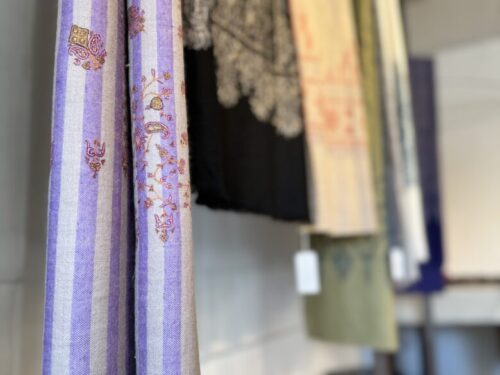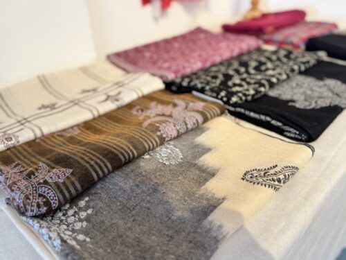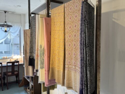 この日の展示はnimai nitaiのパシュミナストール。パシュミナとは高地に生息しているヒマラヤ山羊の冬の間だけ生える柔毛。繊維の宝石とも呼ばれております。