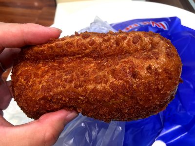縦長い揚げパンですので、一瞬コロッケのようにも見えました。こんがり上がっていて、期待充分です。