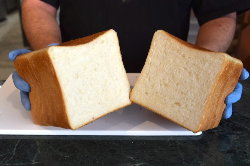 切ってみるとパンの断面が、きめ細やか!! よく見ると、パンの耳がうっすいですよね。中はもちろん耳までずっとフワッフワの食感を楽しんでもらいたいとあえて薄くしているそうです。