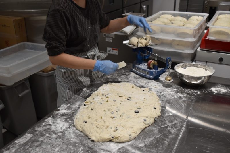 綺麗に混ざった生地を発酵させてから、一つひとつ手作業で計量。