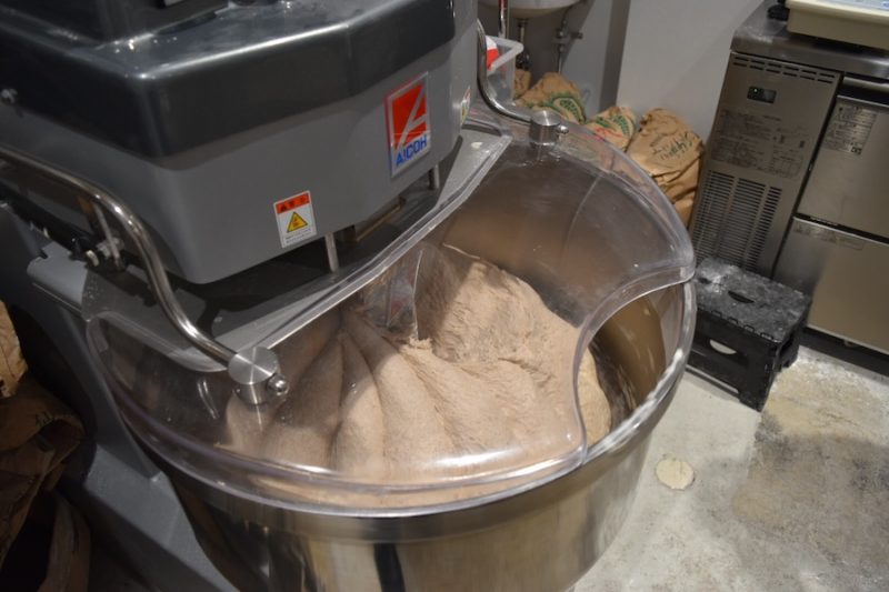 まずミキサーで生地を混ぜていきます。 生地にストレスを加えないよう、最初はやさ〜しく、徐々に早く混ぜていくそう。どんどん肉まんみたいな形に。まだ食パンのイメージとは程遠い感じです。