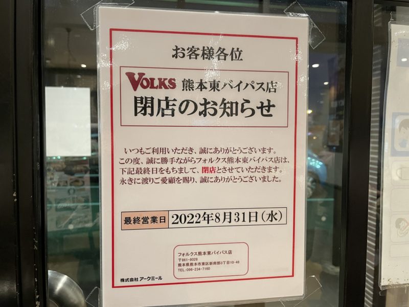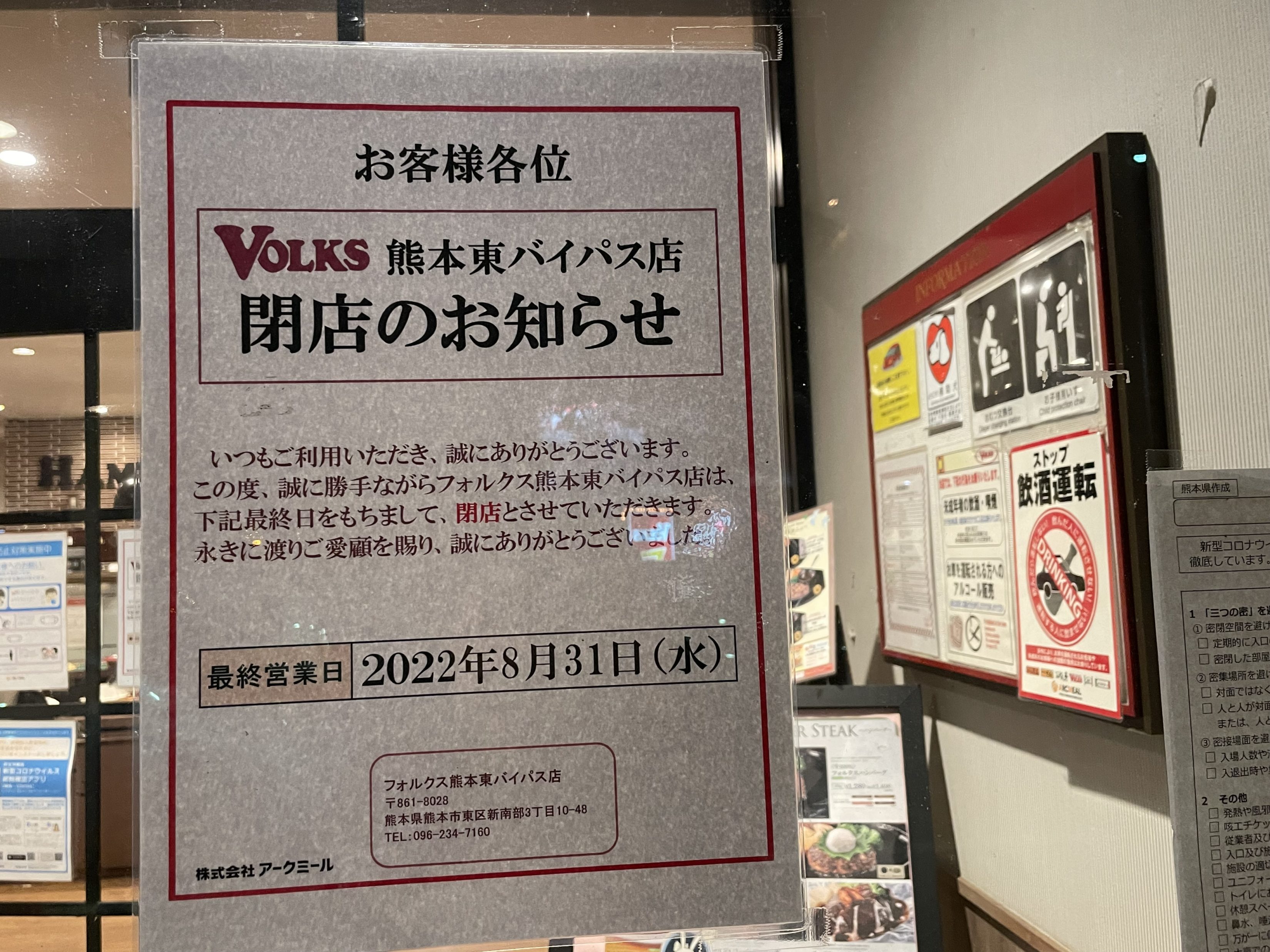 ステーキメインのファミレスとしては、熊本で先駆けだった「フォルクス東バイパス店」が8月31日をもって閉店というショッキングなニュースです。