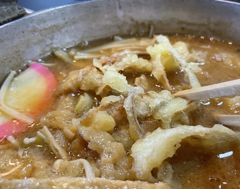 アゲ、かき揚げ、卵、柚子胡椒などを絡め、いろんな味を楽しみつつ、ハフハフしながら一気に食べてしまいました。(鍋は冷めにくいからね)