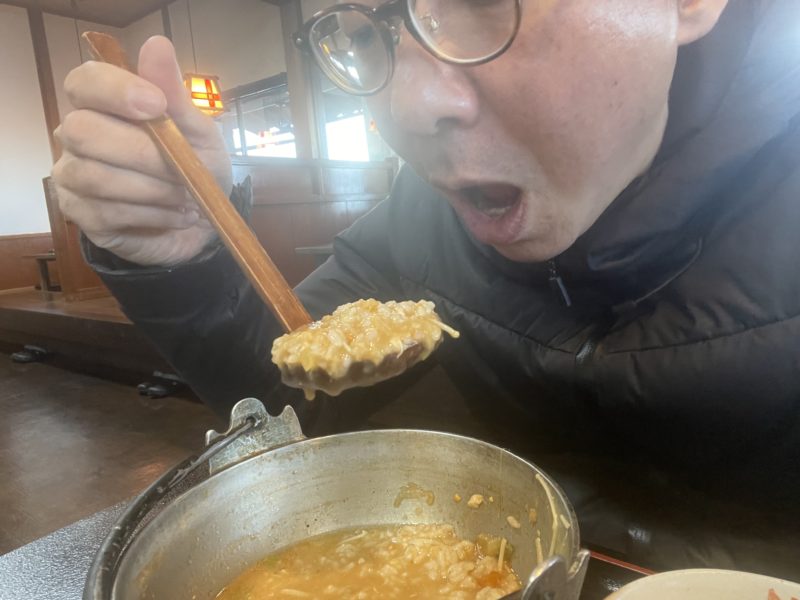 熊本県産味噌を調合して作った味噌煮込みうどんで温まってきた!麺や具を食べた後には鉄板のアレやっちゃう!