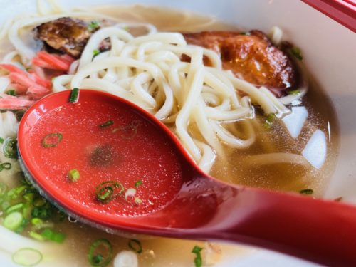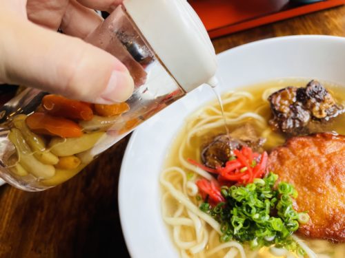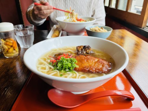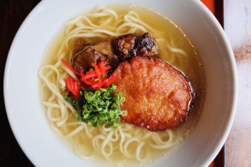 「和・ガンセ」をオープンしてからもソーキそばを食べたいというお客さんが多く、こちらで出されているそうです。透きとおったスープが身体に活力をもたらしてくれます。