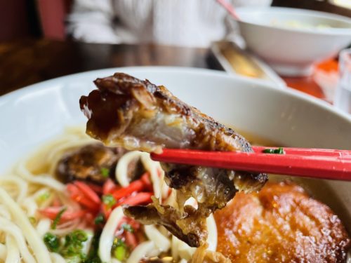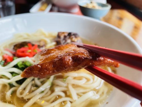 そしてこちらでは豚バラ軟骨だそうですが、お肉がほろほろ。脂身の所がほのかに甘くて、私はソーキそばってもっと癖のあるものだと思っていたので、このほのかな甘さの虜に。