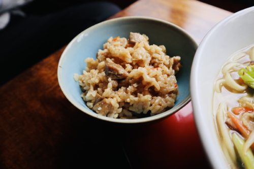 ジューシーと言われる鶏肉、牛蒡、人参を和風出汁でご飯と炊き込む沖縄の炊き込みご飯と、