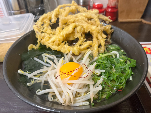 具沢山で贅沢な和囲和囲うどんにしました。うどんの上にはたっぷりのもやし、ねぎ、わかめ。
