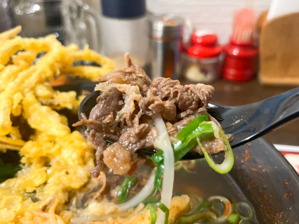 うどんが見えなくなるくらいたっぷりの馬肉が入っています。