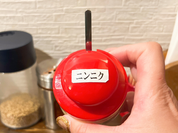 うどんはそのままでも十分美味しいのですが、卓上のトッピングを使うのもおすすめです。驚いたのがニンニク。うどんにニンニク?あまり見ない組み合わせです。