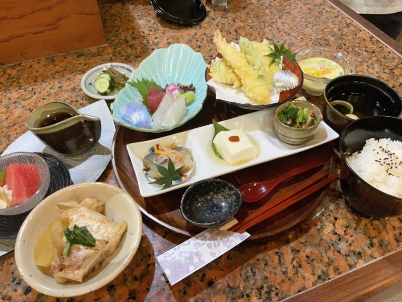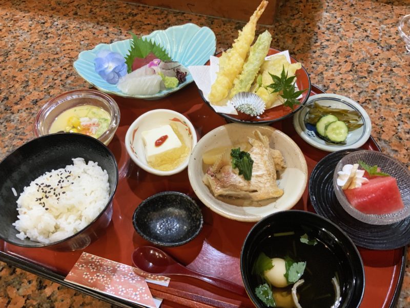 出てきたのがこちら!!!刺し身に天ぷらに煮付けに茶碗蒸し、それに小鉢にデザートも。