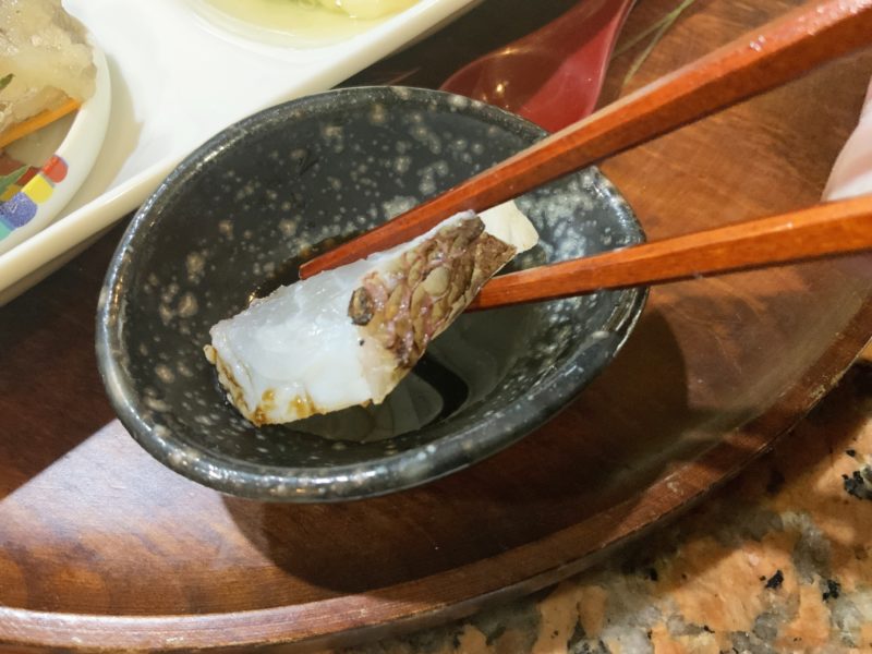 表面を炙った鯛のお刺身は、身が引き締まってプリプリ。表面はほんのり香ばしさを感じてもう最高。
