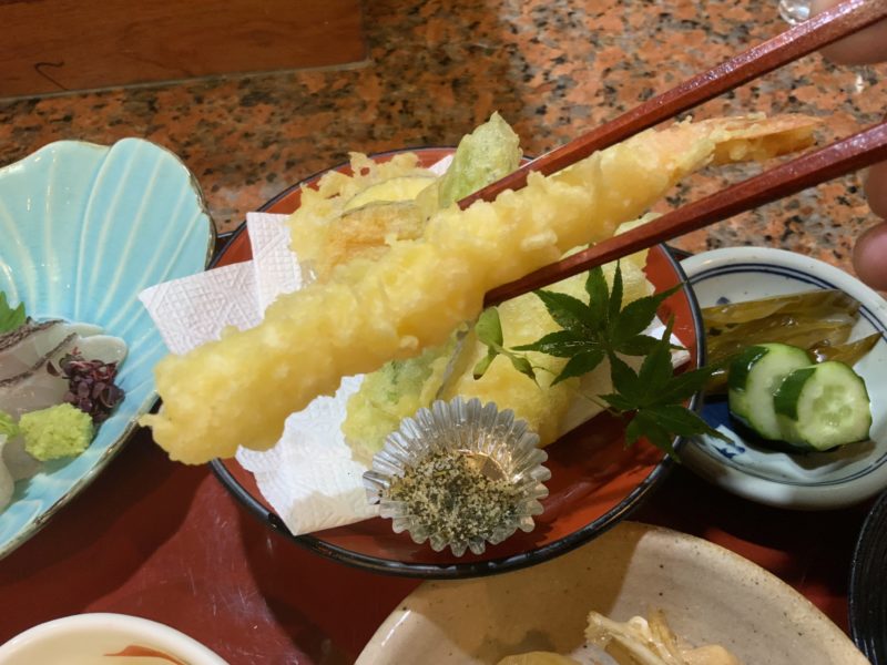 サクサクの衣に包まれた海老はもちろんのこと、アスパラやエリンギなど旬の野菜も相性抜群で美味でした。