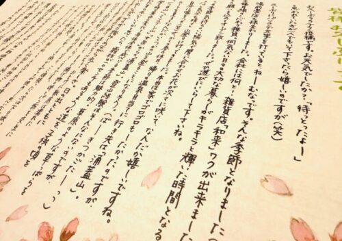 デジタルな時代に丁寧な文字のチラシがとても目立ちます。このチラシがなかなか書けない日が続くと、お店にお電話でお問合せがある事も!そんなにも愛されているのは、手書きならではの優しさや親しみ。お手紙を書く機会が減った今、素晴らしい事だなぁと思います。