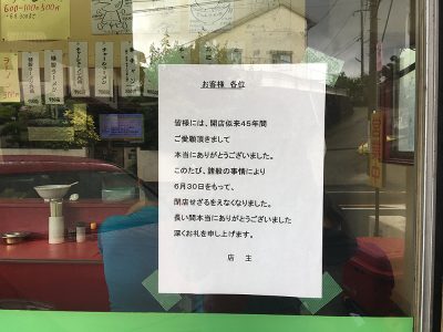 もう月末は土曜日ですのであまり期間はありませんが、昔、ここのラーメンを食べたという方は最後の一杯を食べに立ち寄られてみてはいかがでしょうか?