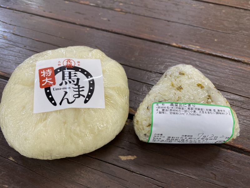 道の駅・阿蘇で「馬まん」と「高菜おにぎり」を買って食べました。