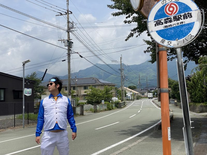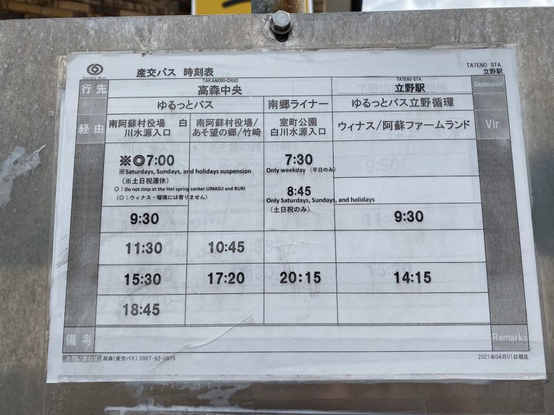 続いて、このバス停から熊本市内から高森町までをつなぐ「たかもり号」に乗って高森駅まで向かうのですが、例に漏れず1日3本です。お気をつけて!
