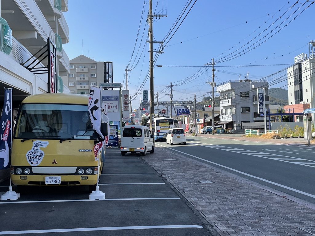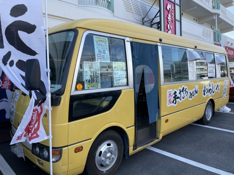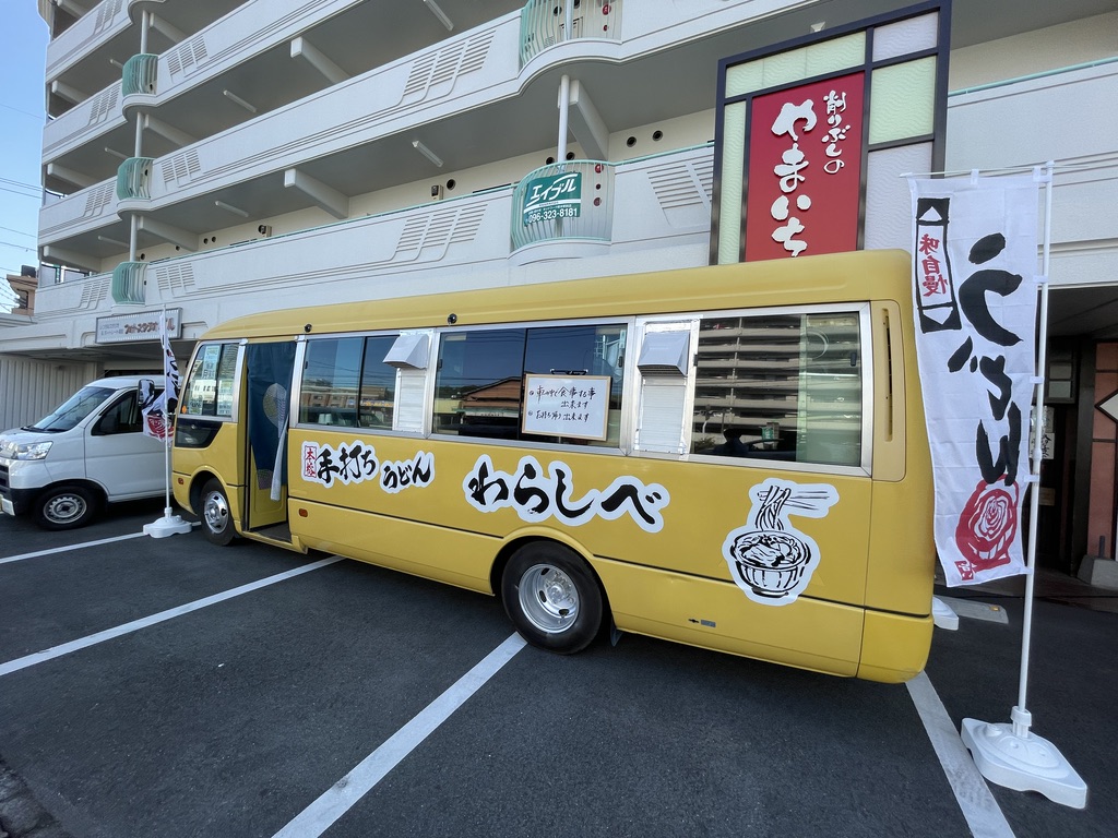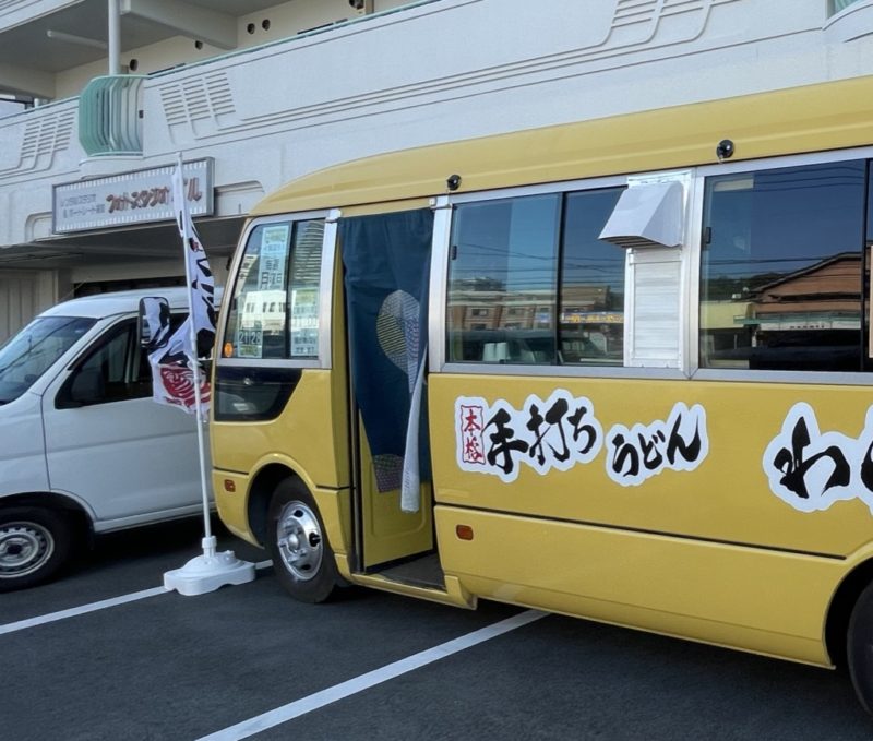 うどんの幟が立った黄色いバスを発見!何じゃありゃ??
