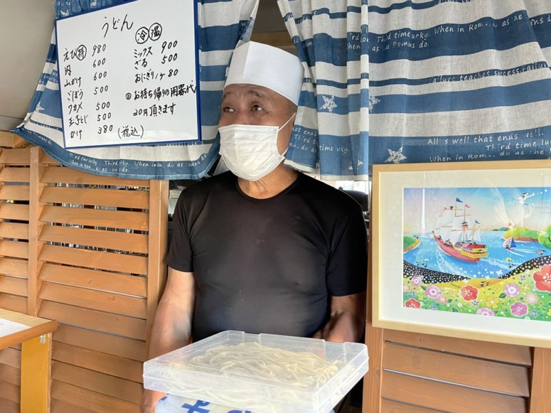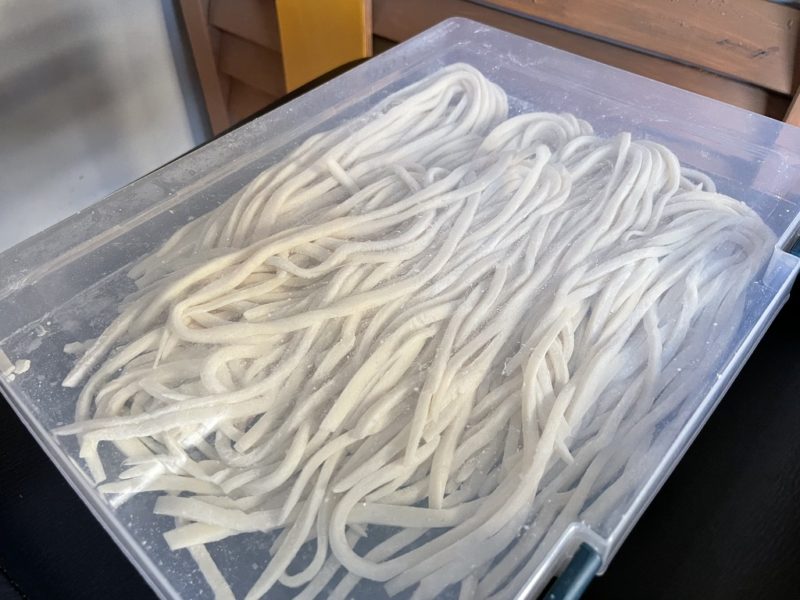 打ったばかりのうどん、見せてもらいました。バスで食べることを見越して配合してるようです。食べる環境に合わせないと美味しく食べれない、デリケートな食べ物ですよね。