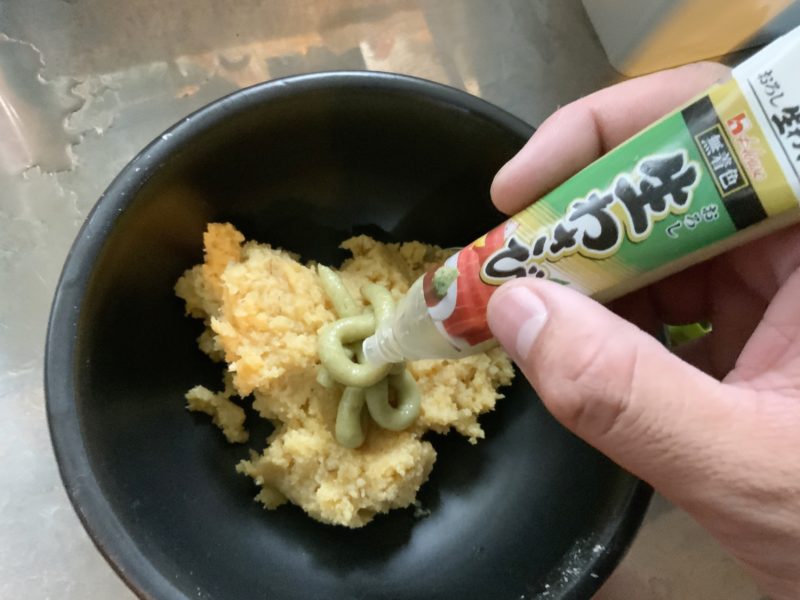 まずは中に詰めるわさび味噌を作ります。本当は新鮮な生わさびがあればすりおろして使いたいところですが、今回はチューブで。