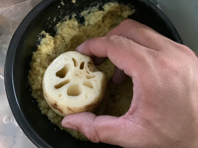 つなぎで卵を塗りつけた先ほどの蓮根を転がしながら衣をまとわせていきます。