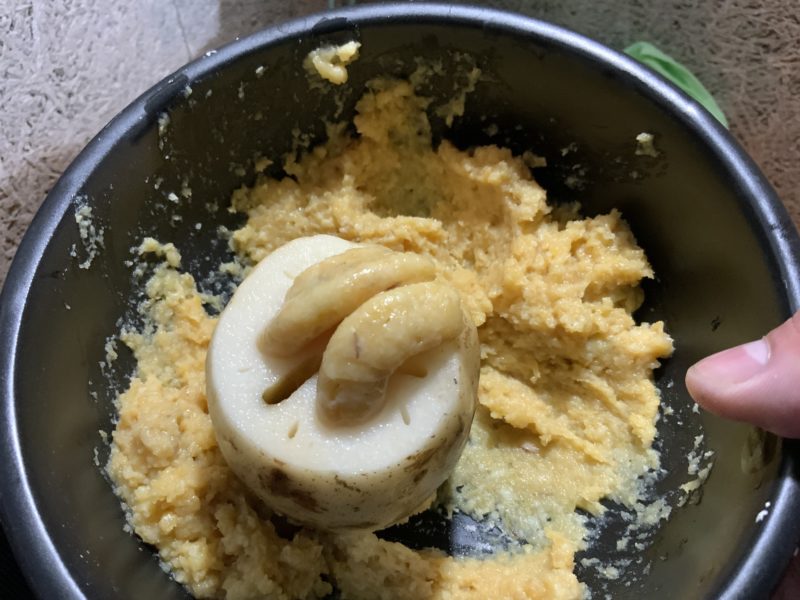 これをぎゅぎゅっと押し込むようにして、蓮根に詰めていきます。