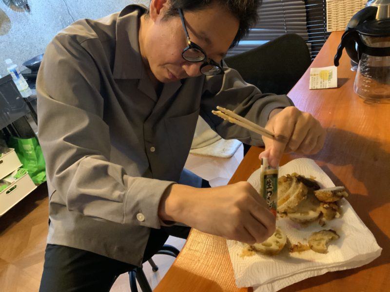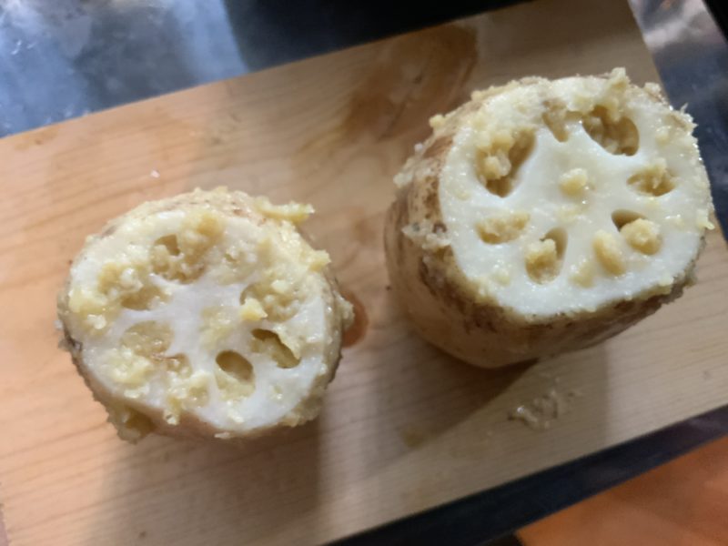 味噌が抜け落ちてしまった蓮根の穴にわさびを詰め始めました。本当、自由だなこの人。