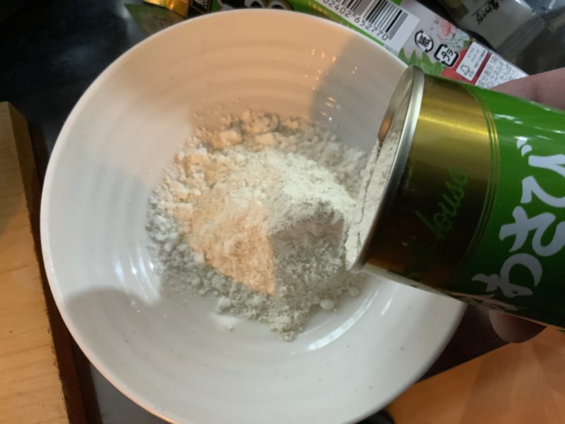 色味を出すために、小麦粉に粉わさびを混ぜます。初めて使うんですけど、蓋を開けてびっくり。粉わさびってこんなに白いんだ。