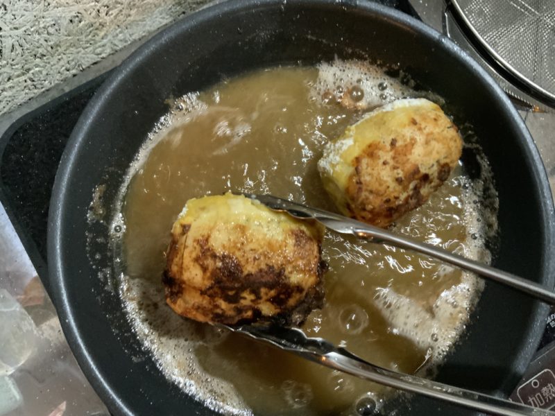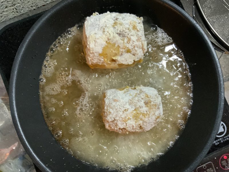 では、いよいよ揚げていきましょう。貧乏性なので油は少なめで転がしながら揚げていきます。