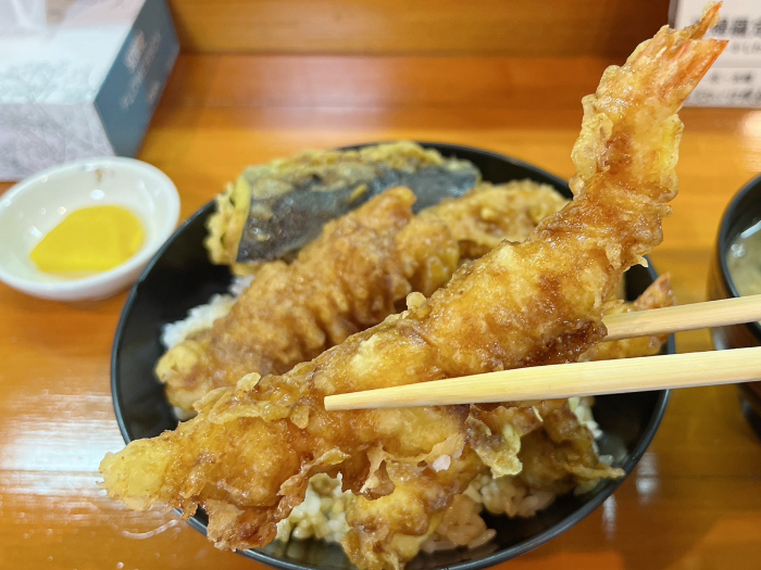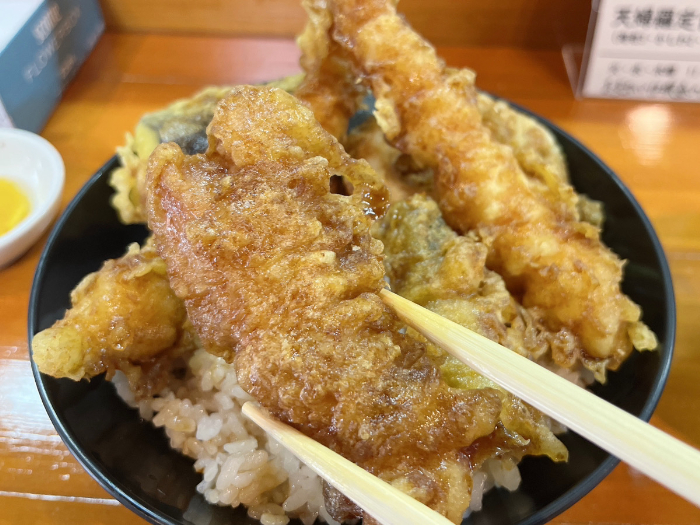 まずは海老天。驚くほどカリっと揚げられています。そして中からは旨味がギュッとつまった海老。甘みと塩味のバランスの良いタレとの相性も抜群です。