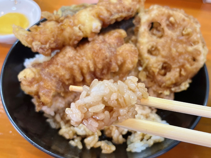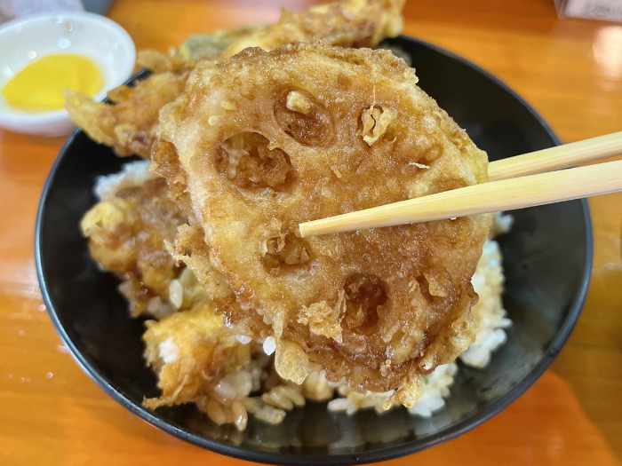 つぎは、野菜天。衣の中からは、しゃくしゃくと歯ごたえの良いレンコンが出てきました。