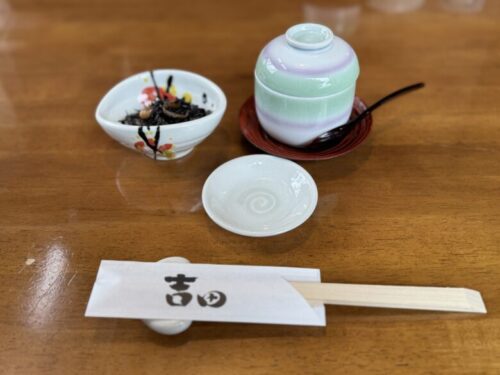 ひじきの煮物と茶碗蒸しが運ばれて来ました。茶碗蒸しはとっても熱い!うかがったのは1月で、手足がかじかむ日でしたので、