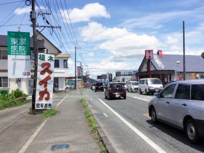 スイカのシーズンになると、植木町ではスイカと書かれている看板を多数見ることができる。