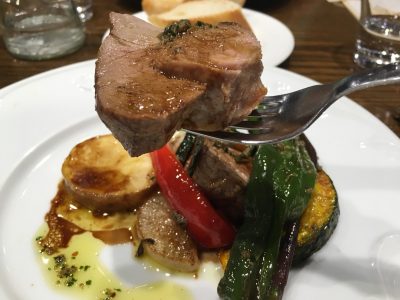 豚のソテーの厚みが半端ない!このボリュームの豚肉が2切れありましたが、身が柔らかく、バルサミコソースもさっぱりしていたので、ぺろりと食べられました。