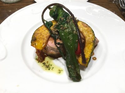 分厚い豚のソテーの上に、かぼちゃやししとうなどが大胆にのせられていて、おしゃれな盛り付けです。