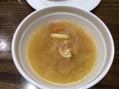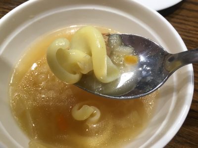 大きなマカロニが2個入っていて、スープなのに食べ応えも十分です。
