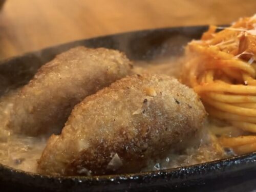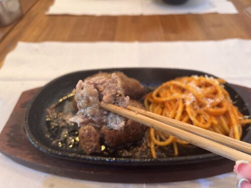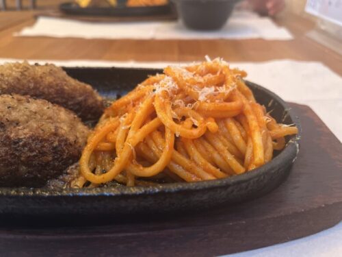 一緒に鉄板の上に乗っているナポリタンもしっかりとした味付けです。炭水化物なのになぜかごはんが欲しくなります。